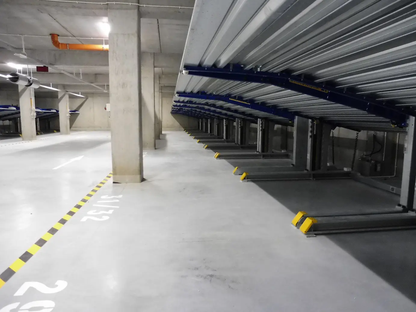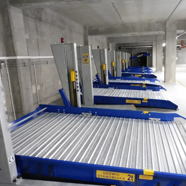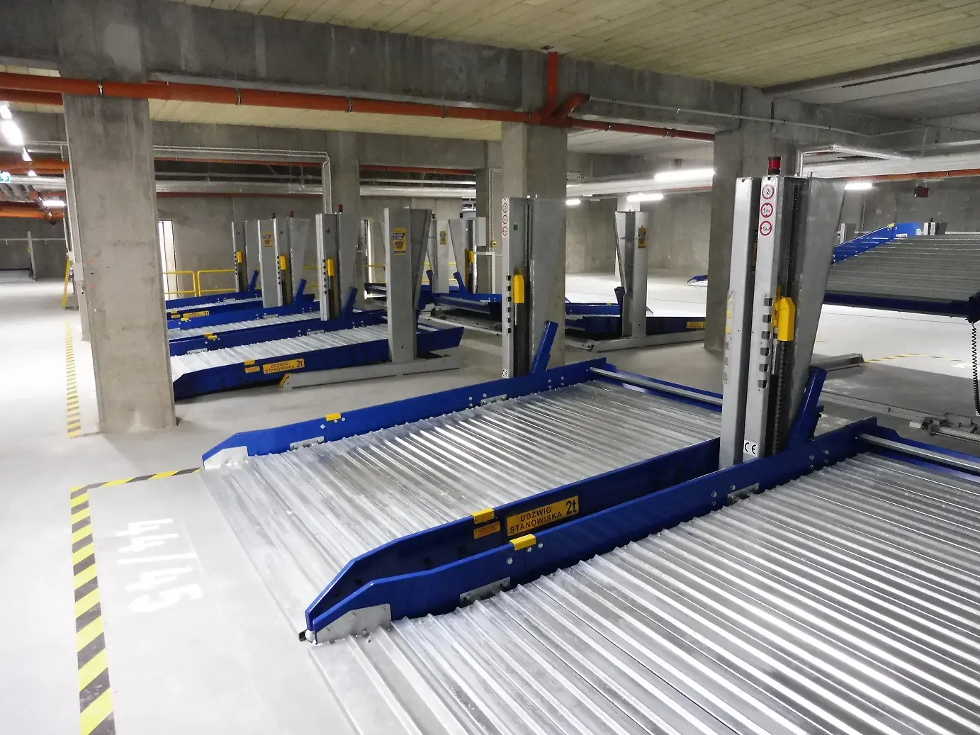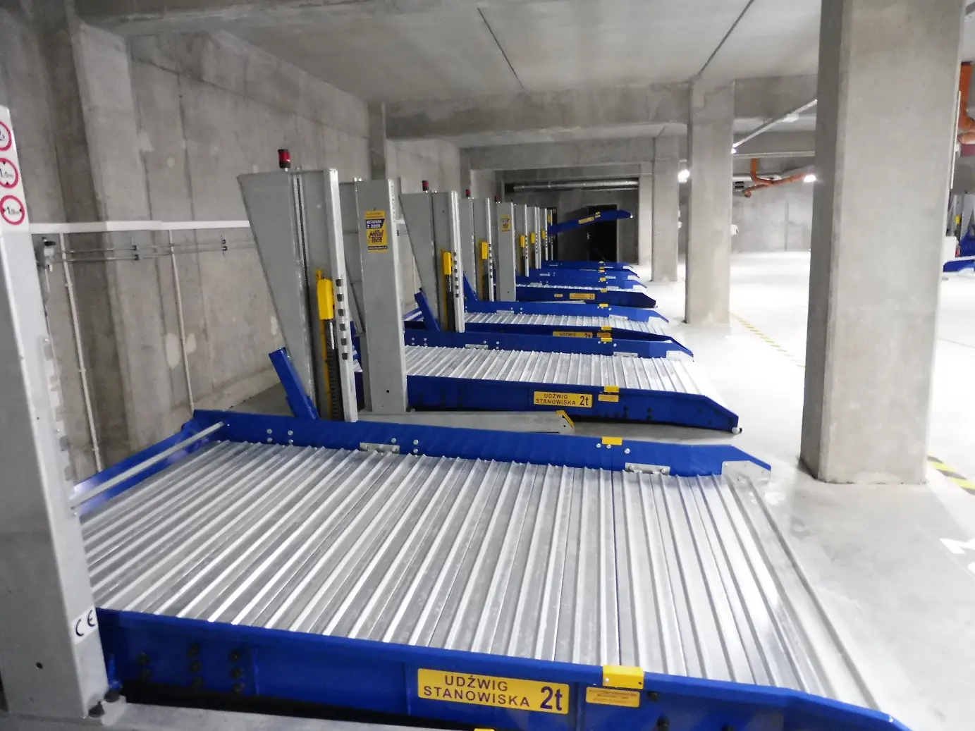 Instalacja zależnych platform parkingowych w inwestycji Zielony Marcelin w Poznaniu.