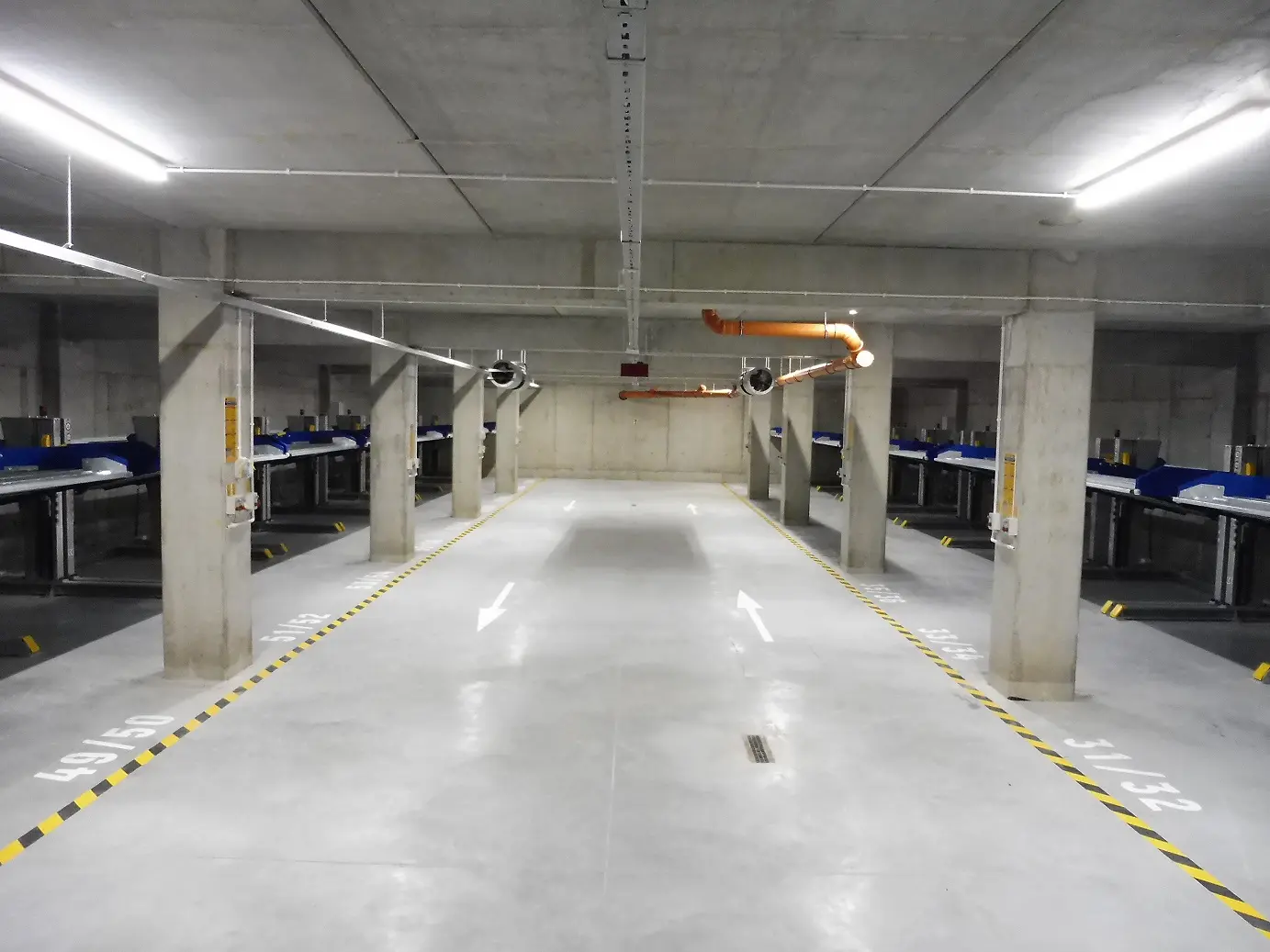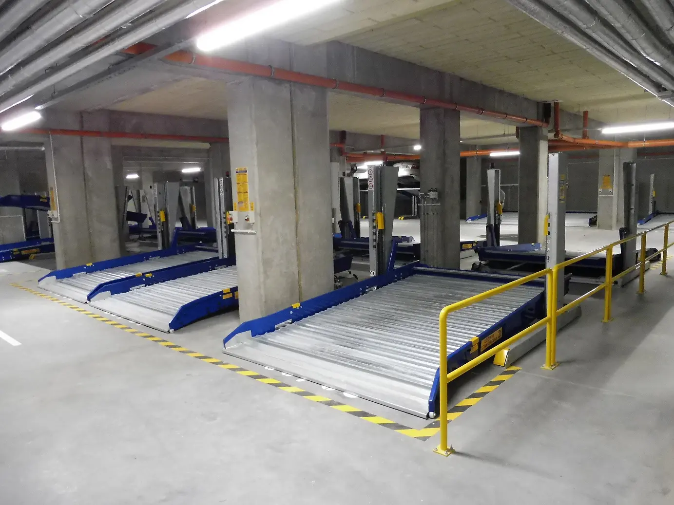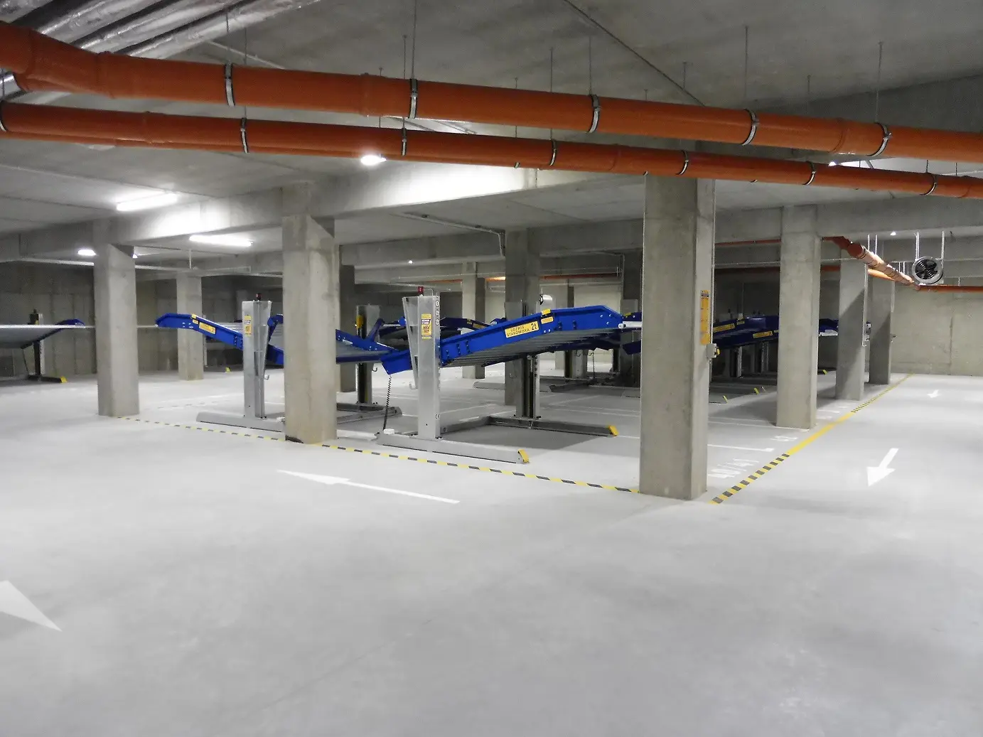 Instalacja zależnych platform parkingowych w inwestycji Zielony Marcelin w Poznaniu.