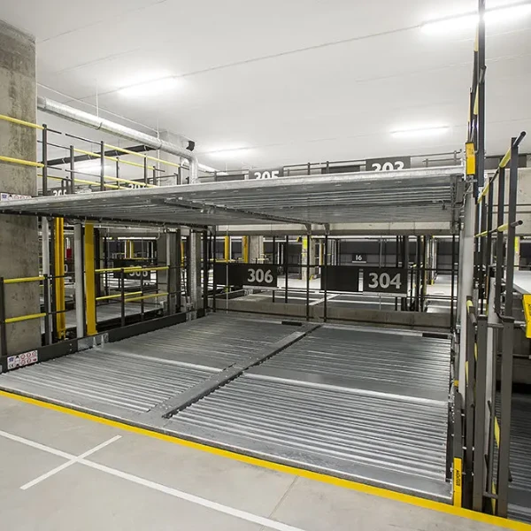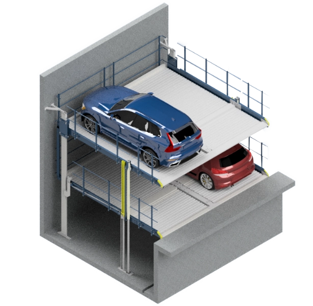 The platform is equipped with railings, individually designed for both upper and lower parking spaces, additionally fitted with protective padding to safeguard the driver’s door.