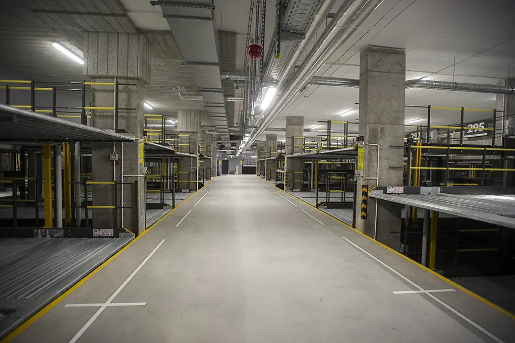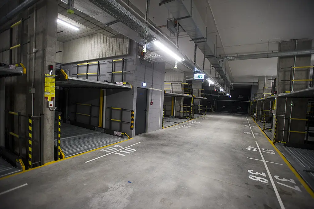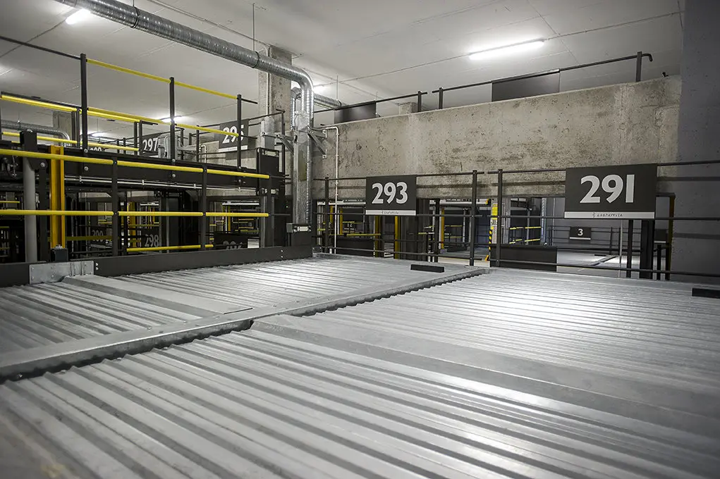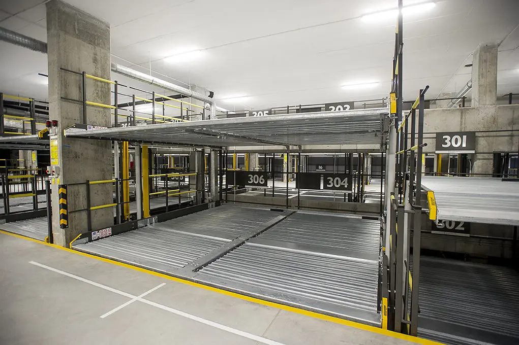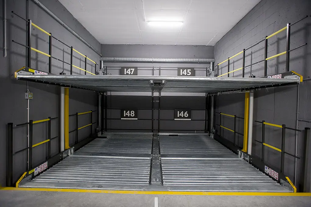 The platform is equipped with railings, individually designed for both upper and lower parking spaces, additionally fitted with protective padding to safeguard the driver’s door.