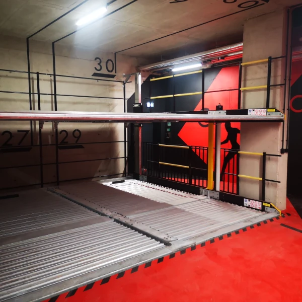Platforma wyposażona w balustrady, indywidualne dla górnych i dolnych miejsc parkingowych, dodatkowo zabezpieczone otuliną chroniącą drzwi kierowcy.
