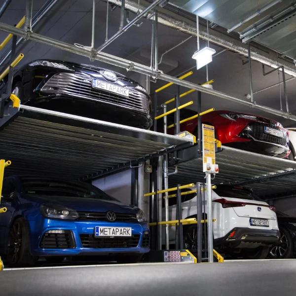 The platform is equipped with railings, individually designed for both upper and lower parking spaces, additionally fitted with protective padding to safeguard the driver’s door.