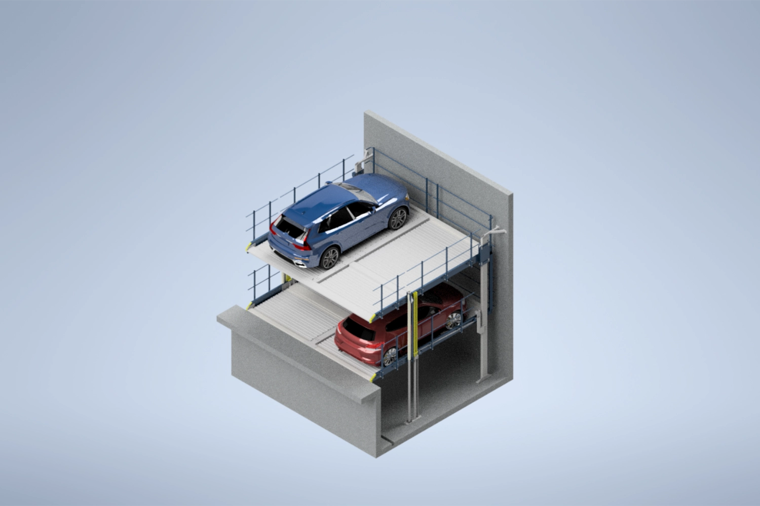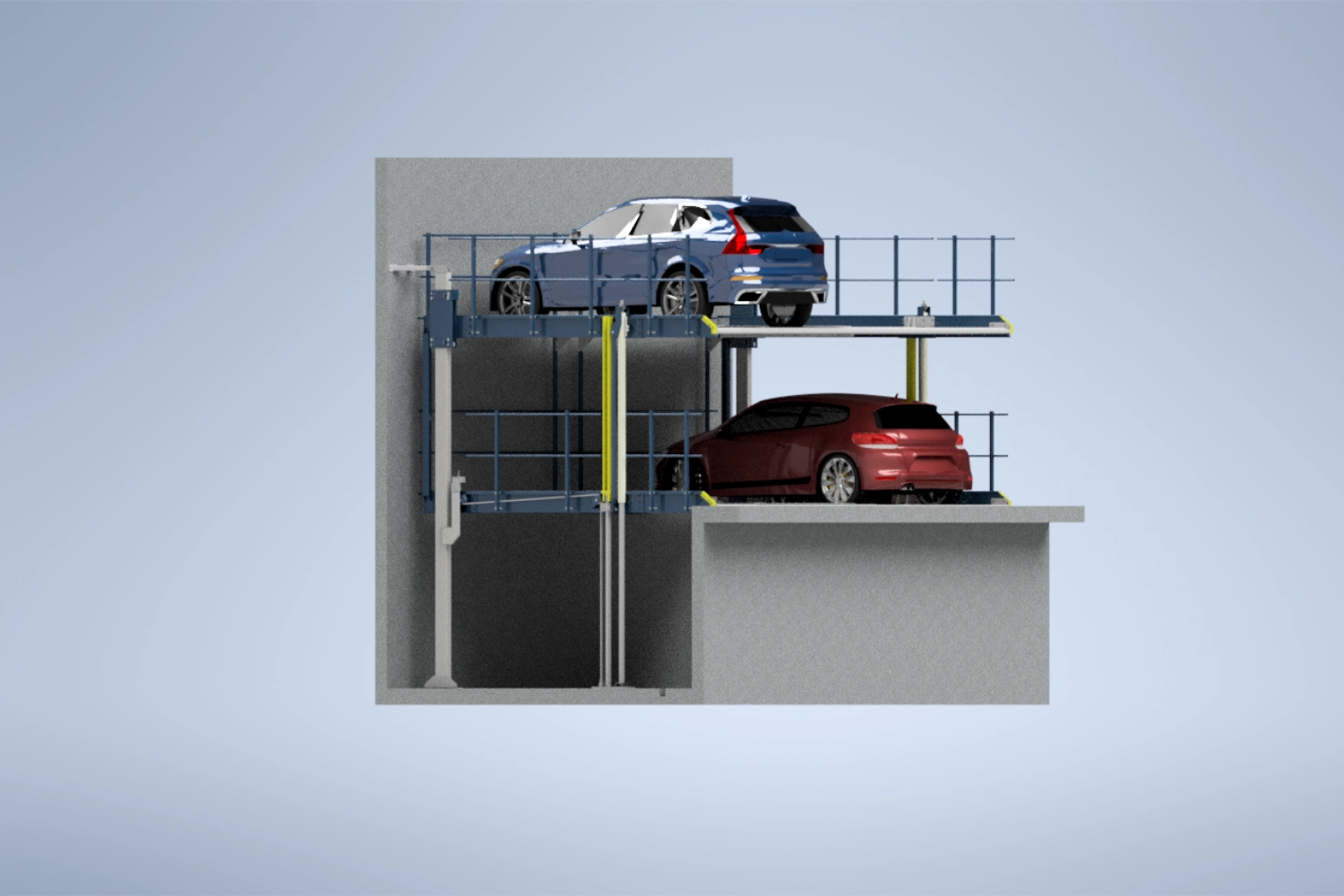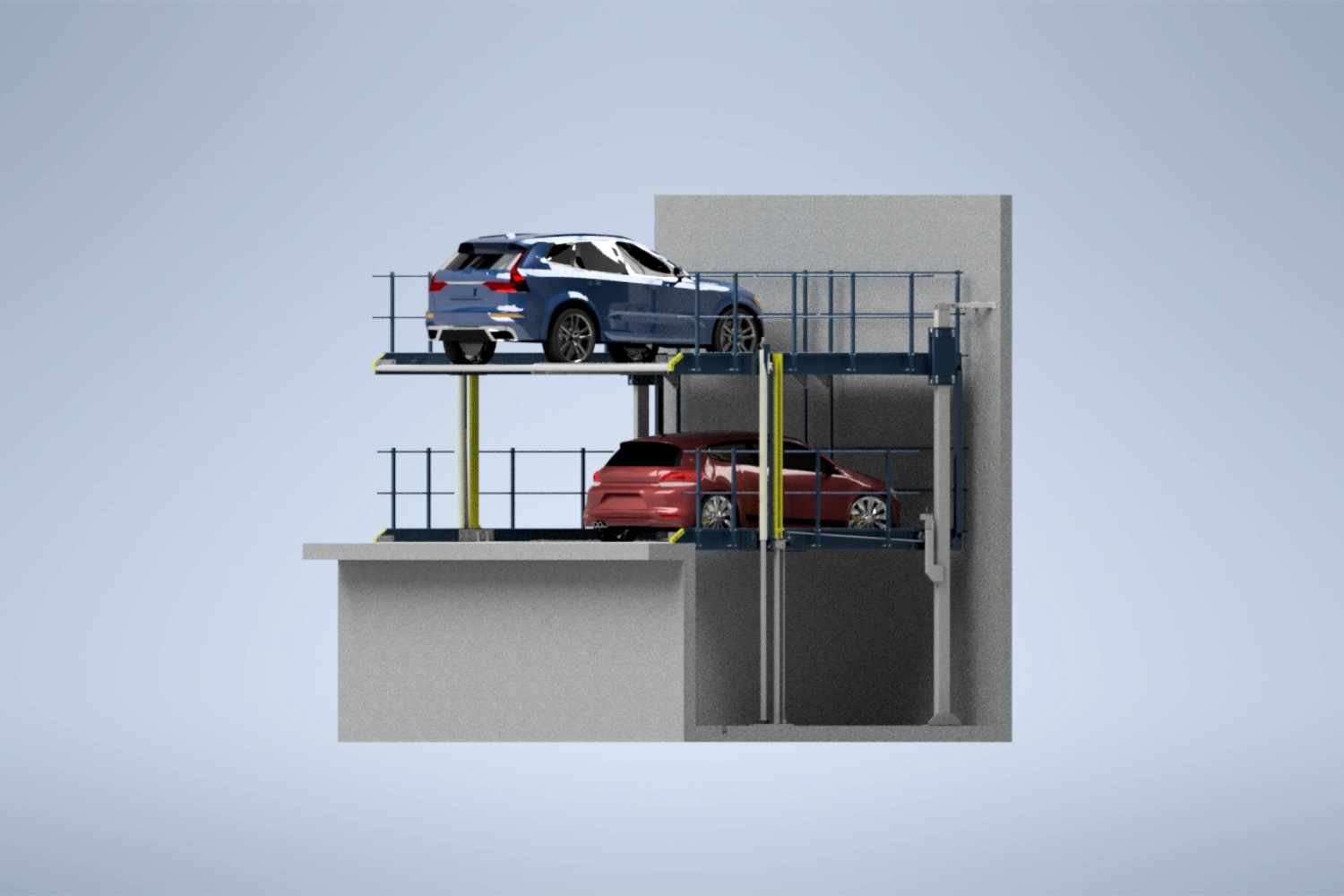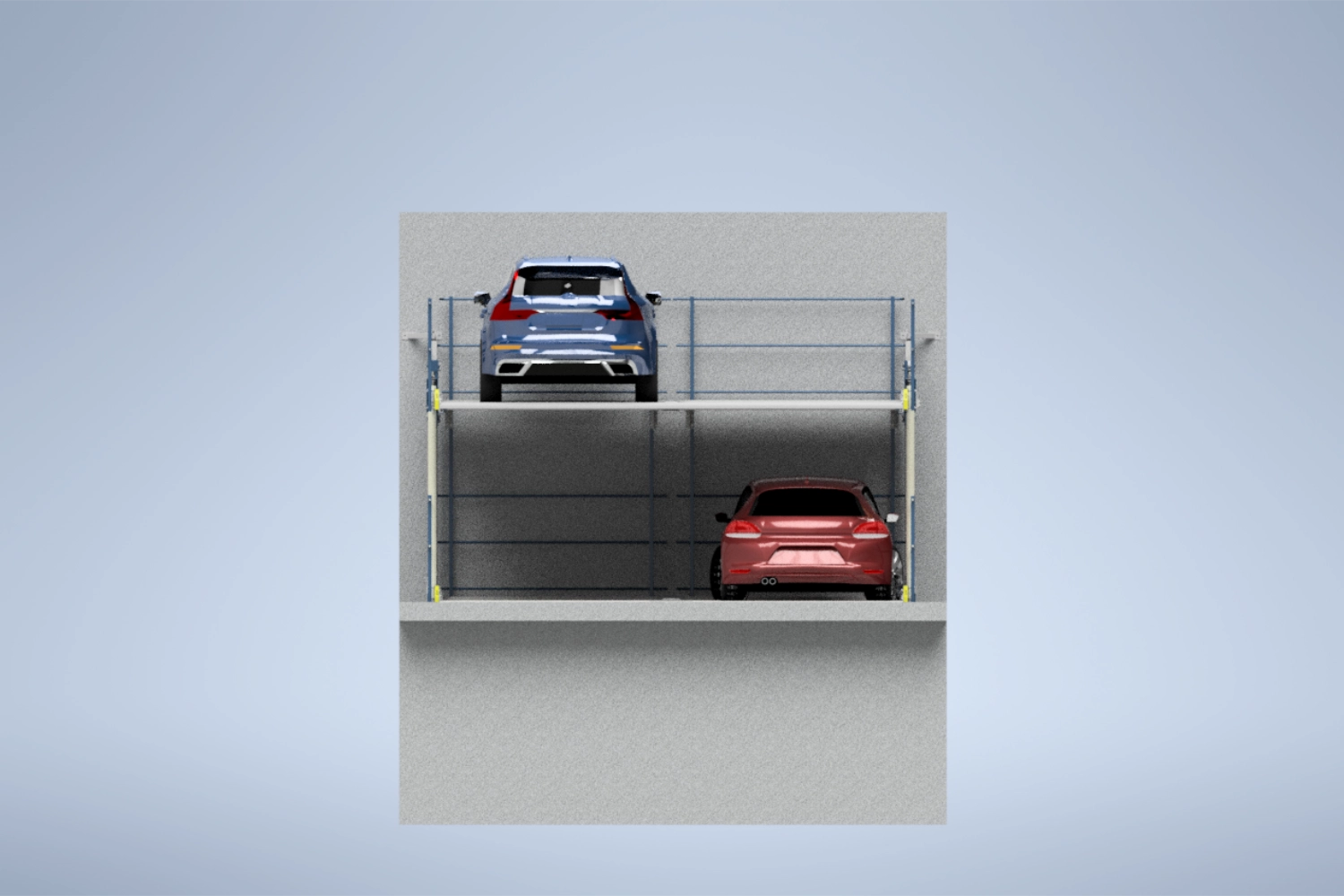 The platform is equipped with railings, individually designed for both upper and lower parking spaces, additionally fitted with protective padding to safeguard the driver’s door.