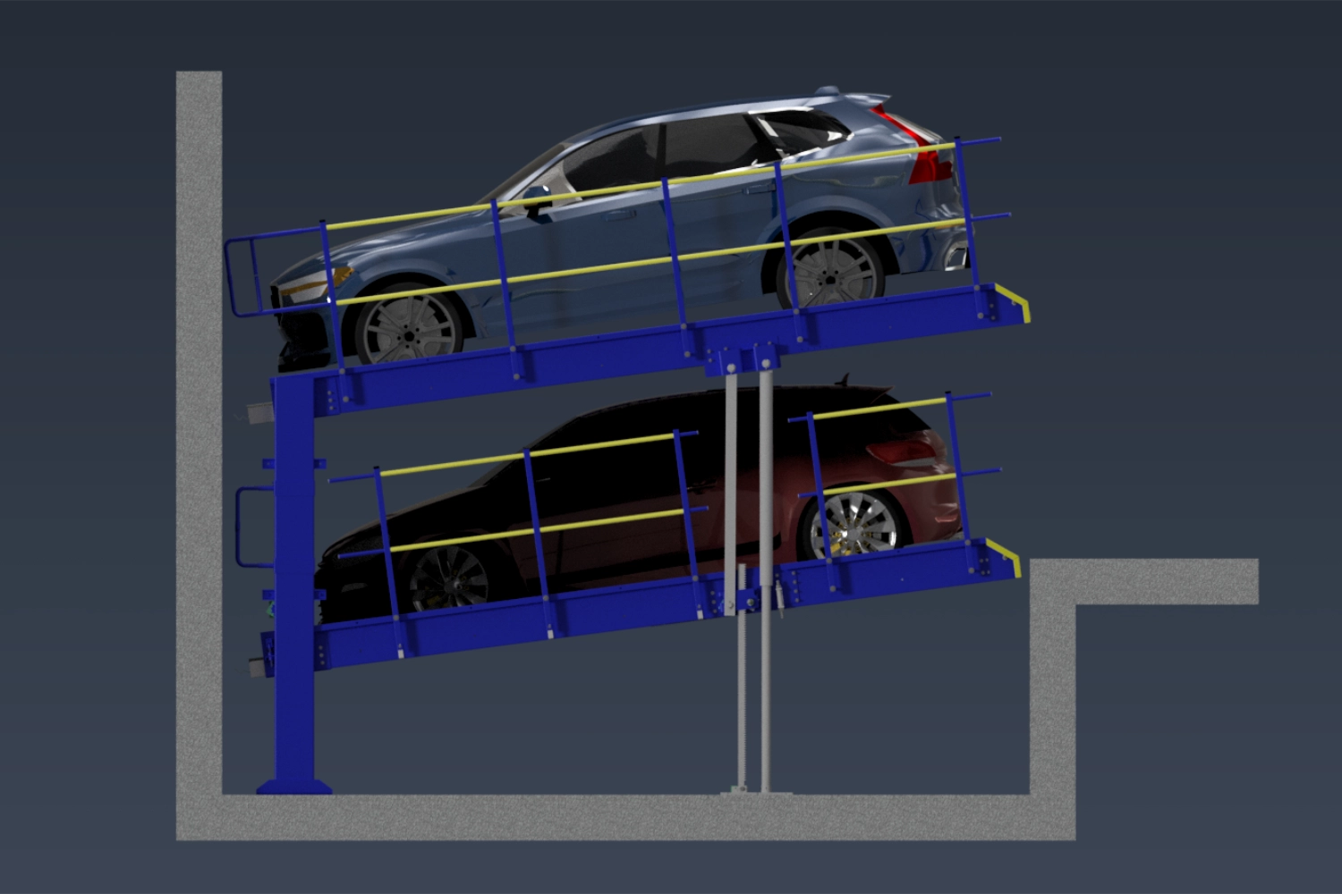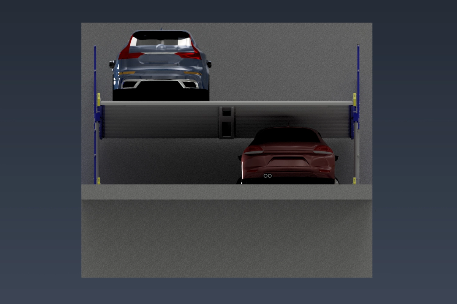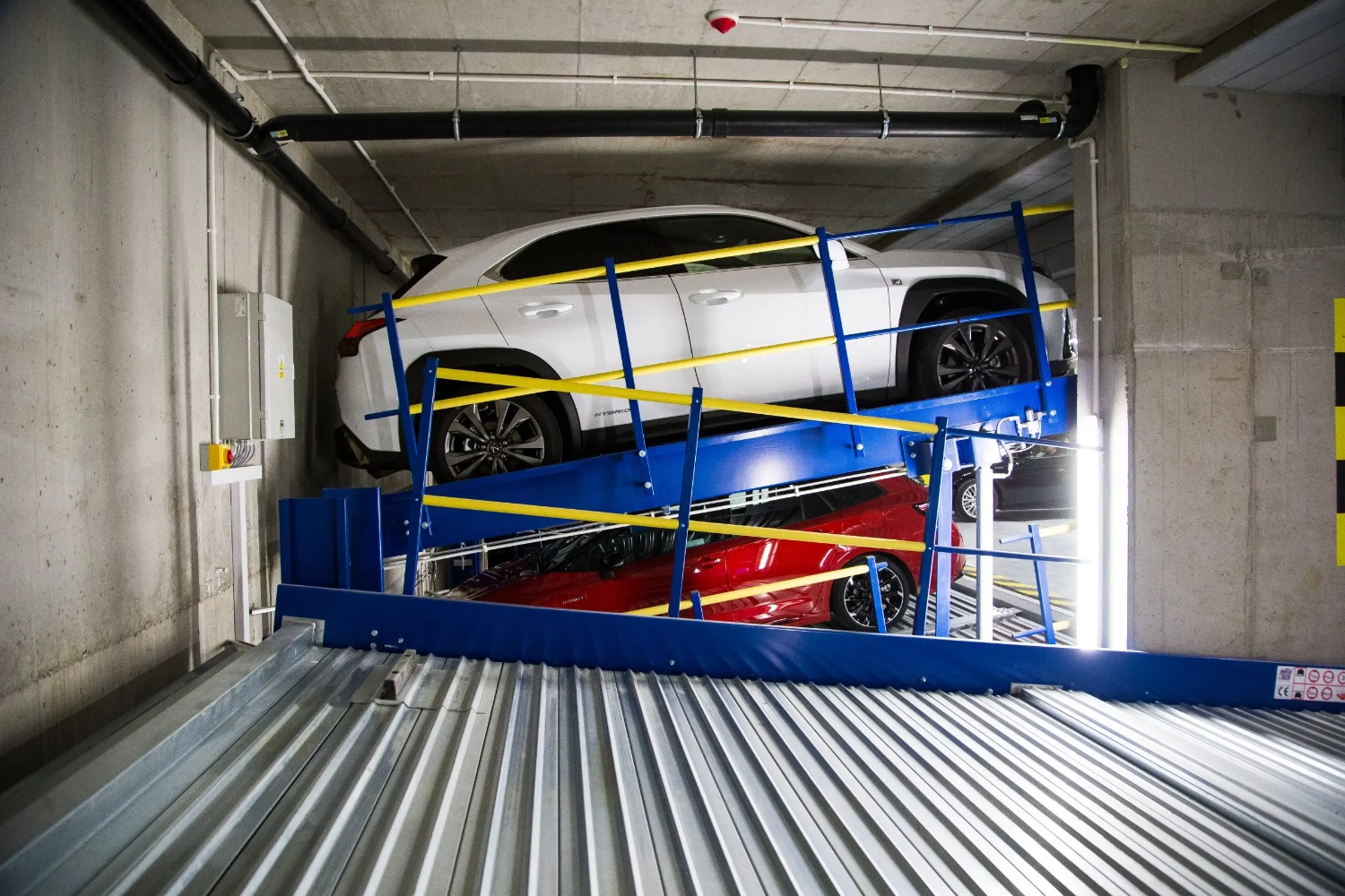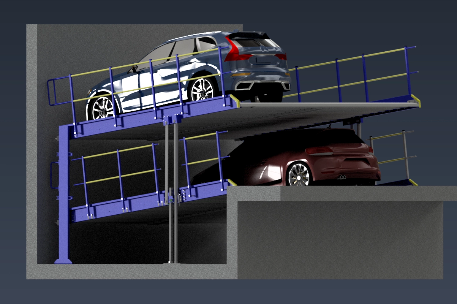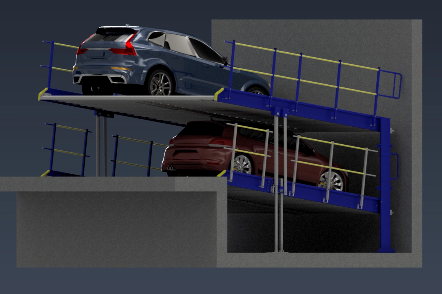 The platform is equipped with railings, individually designed for both upper and lower parking spaces, additionally fitted with protective padding to safeguard the driver’s door.